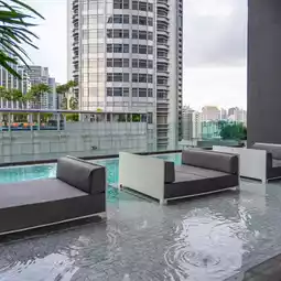 Infinity pool with stunning Thonglor views. 🏊♀️ Large fitness center. A full range of playground equipment 💪 and a kids' room for families with young children 👶 For those into wellness, there's a sauna and hot tub for a relaxing soak 🧖♀️