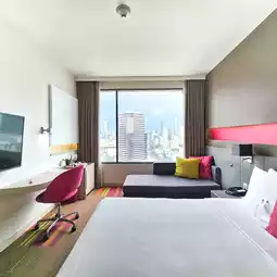 The hotel's interior is decorated in modern tones, elegant but not cold. The lobby is open and airy, with plenty of cool photo spots. 📸 The rooms are incredibly clean! There are several room types to choose from, including City View and Stadium View. The high-floor view is stunning, offering panoramic views of the stadium and the BTS Skytrain. 🌇 The bathroom is spacious, with separate sinks for wet and dry areas. 🛁