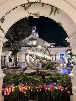 An enchanting and cozy Halloween night is happening at Chocolate Ville! 🌙 This year, they’ve gone all out with colorful lights, vibrant pumpkins, and European-style houses transformed into a "Fashionable Ghost Village." The sunset view is absolutely stunning, with golden rays shining through the tower and the chapel on the water, giving off a classy British Halloween vibe. 🎩