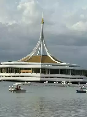 • The Chalerm Phra Kiat Building of King Rama IX, surrounded by flower gardens and a large pond.