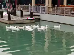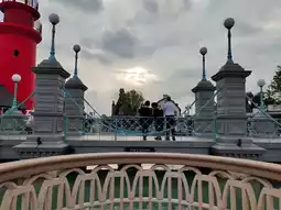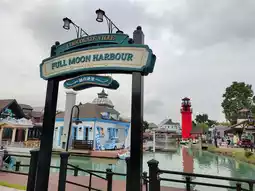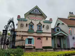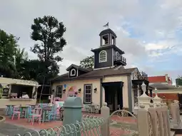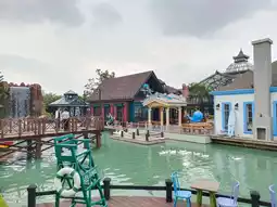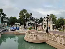 A cute shop with a white tower surrounded by European-style houses and a pond with many photo spots. Themed around the festival.