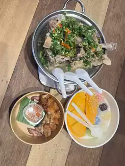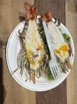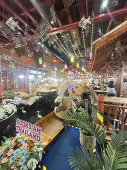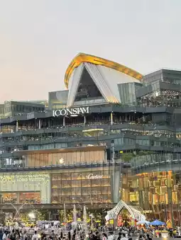 Next, we headed to ICONSIAM for lunch. I absolutely adore the design here—it brings the floating market indoors 🥰, exuding a strong traditional Thai vibe. We tried the volcano ribs, mango sticky rice, grilled pork, grilled river prawns, and durian. Every snack here is delicious and foolproof 😋. There are also seats on the second floor, so you can check there for a spot 🤗. It's a great place to shop comfortably too 💕.