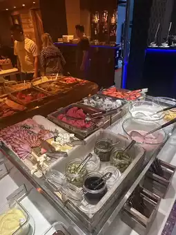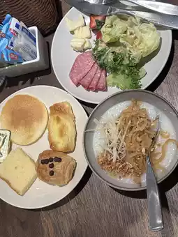 This morning, we went down for breakfast around 8 AM. The breakfast line was excellent, with just the right amount of variety—not too much or too little. There were various drinks to choose from, cereals for kids, French bread, croissants, and other pastries. There was also rice porridge with condiments, and my favorite was the finely sliced ginger, which I loved. There were salami, cheese, salad, and fruits. Overall, it was excellent.