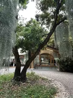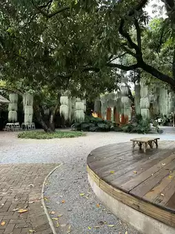 This relaxing garden cafe features a wooden deck and a high-ceilinged pavilion beneath a large tree. The swaying Spanish moss and the greenery seen through the glass windows make for picturesque scenes. 📸 The circular plaza with benches and the hanging swings are also great photo spots. The covered area can also be used as a shelter from the rain, and you can relax with the sounds of nature playing in the background.
