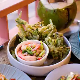 The Crispy Morning Glory Spicy Salad delivers crunch and zest, pairing deep-fried water morning glory with a refreshing mix of shrimp, herbs, lime juice, and chili. Rounding off the spread is the ผัดสามเหม็น (Pad Sam Meun), or “three stinky stir-fry,” a bold dish made with petai beans, garlic chives, and shrimp paste, stir-fried with prawns for a rich, umami-packed flavor that fans of strong, distinctive tastes will appreciate.