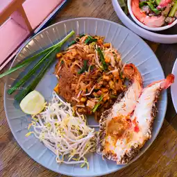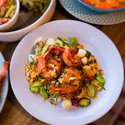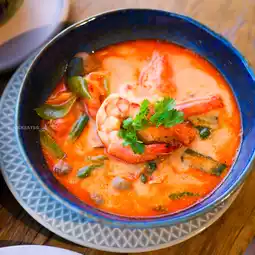 Among its offerings, the Pad Thai with Grilled River Prawns features stir-fried rice noodles with egg, tofu, and bean sprouts in a tangy tamarind sauce, topped with a smoky river prawn that lends a subtle briny sweetness. The Tom Yum Kung, made with five succulent shrimp, stands out with its aromatic blend of lemongrass, galangal, kaffir lime, and chili paste — a perfect balance of spicy, sour, and creamy notes.