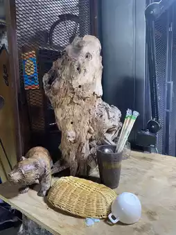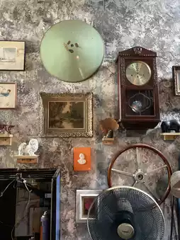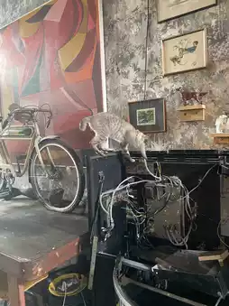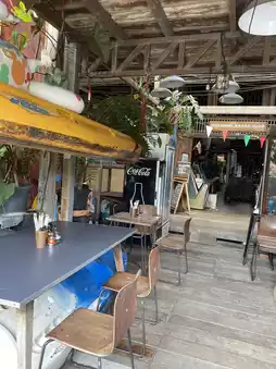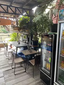 The interior design is absolutely fantastic! 🖼️ It’s beautiful and full of style, blending vintage antiques, wooden tables, industrial-style furniture, and cool artwork. It has so much charm and countless spots for photos! The inner area is cozy, and the front area, right by the water where the kayaks are docked, offers a wonderful atmosphere. Plus, there is an adorable resident cat 🐈 that welcomes guests—a definite treat for cat lovers!