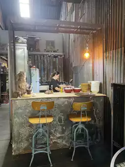 การตกแต่งร้านคือที่สุด! 🖼️ สวยงามและมีสไตล์มากๆ เป็นการผสมผสานของ ของเก่าสุดวินเทจ โต๊ะไม้ เฟอร์นิเจอร์แนว Industrial และงานศิลปะเก๋ๆ ดูมีเสน่ห์และมุมถ่ายรูปเพียบ! โซนด้านในดูอบอุ่น ส่วนด้านหน้าติดริมน้ำมีเรือคายัคจอดอยู่ บรรยากาศดีสุด ๆ นอกจากนี้ยังมี น้องแมวเหมียว 🐈 สุดน่ารักคอยต้อนรับลูกค้าด้วยนะทาสแมวต้องเลิฟเลย!