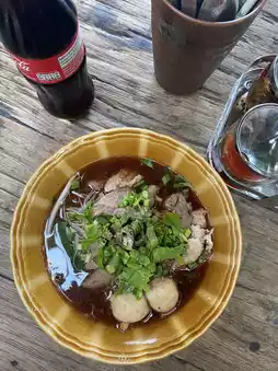 This place sells Nam Tok noodles (the sign in front of the shop says they offer thin noodles, rice vermicelli, egg noodles, wide noodles, and instant noodles). The bowl we ordered was the Nam Tok pork noodles. The flavor was quite good, well-balanced, and fragrant with spices. The meat and meatballs were delicious, and the portions were generous. And, most importantly, the price was incredibly reasonable. It's worth a visit to relax by the water and enjoy delicious noodles in a restaurant that looks like a studio!