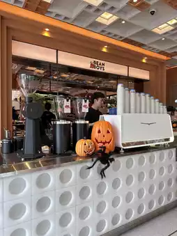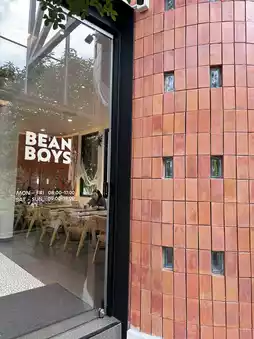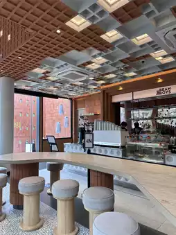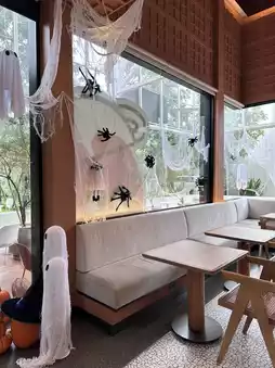Located on the expressway, Pradit Manutham Road, this cafe offers ample parking. The shop features clear glass and orange tones, contrasting with the shady trees outside. There's plenty of seating inside.