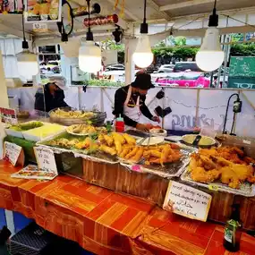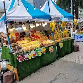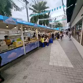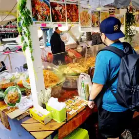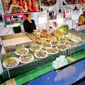 At the base of this bridge upon reaching Platinum Fashion Mall you will be able to see a long stretch of food vendor stalls selling from Japanese bbq or takoyaki balls to the local Thai noodles like pad Thai with different variation of ingredients or BBQ Skewers like octopus, shrimps, beef and fish balls, chicken wings and such, to Thai dessert like red Ruby and mango sticky rice to their fried shrimp and chicken as well!