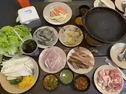 🥩 The food line has a variety of dishes, including sliced pork, chicken, shrimp, squid, fish, and various vegetables, including premium beef. At this branch, you have to order from the staff. The food runs out quickly, but it's good that they refill it quickly. As for the dishes, don't even mention it, they run out very quickly!!