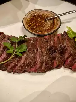 "Crying Tiger Grilled Beef" (1,200 baht) The beef has just the right amount of fat, marinated with various spices and probably sous vide, then grilled to medium. The meat is very tender, not tough, and delicious when eaten with the jaew sauce.