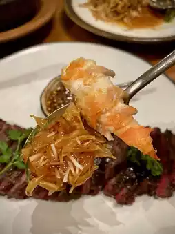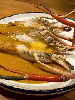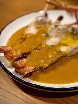 “Chu Chee River Prawns” (1,950 baht) 2 large river prawns are grilled and topped with a thick Chu Chee sauce mixed with a fragrant lime leaf and roasted coconut. The fresh river prawns are firm and have juicy shrimp roe. The bouncy meat goes well with the Chu Chee sauce, which is a great flavor enhancer. Served with brown rice, it's awesome!