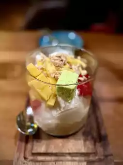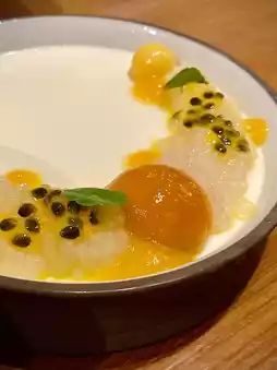 "Lemongrass Panna Cotta" (400 baht) The texture of the panna cotta is smooth and soft, with a fragrant lemongrass scent, and a prominent sour taste from fresh passion fruit. Topped with diced Nam Dok Mai mango.