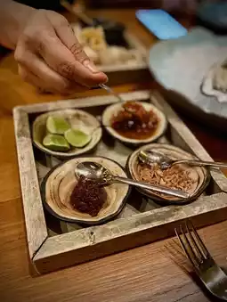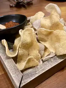 “Khao Kreab and Seafood Dipping Sauce” (Complimentary) Shrimp crackers are served with freshly made spicy sauce at the table. The sour taste from the passion fruit juice makes this menu stand out immediately.