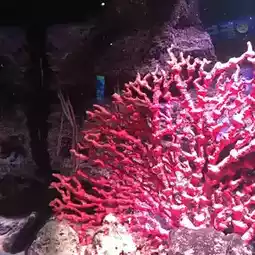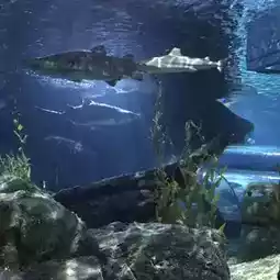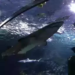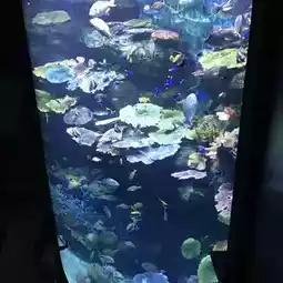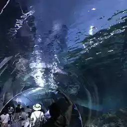 The aquarium has an underwater tunnel. When visitors walk in the tunnel, the left and right sides and the ceiling are surrounded by glass. Outside the glass is water, and they can see fish swimming by their side and over their heads, from small tropical fish to large sharks. It feels as if they are underwater just like them.