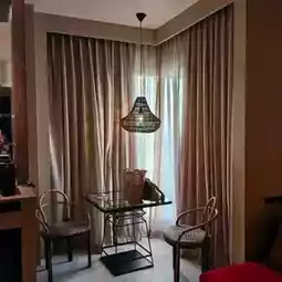 Lovely working table with a lazy resting chair so comfy, a mini dining table on the corner, surrounded with a glass wall, see-through Bangkok sky.