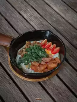 👉🏻 Pan Baked Eggs (130.-) with lots of toppings There are Chinese sausage, minced pork, sprinkled with chopped spring onions.