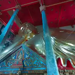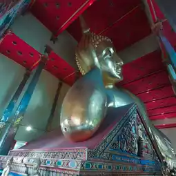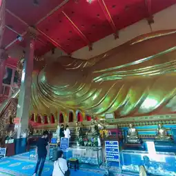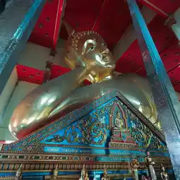 Wat Bang Phli Yai Klang is located on the north bank of Khlong Samrong, Tambon Bang Phli Yai. It is the home of Somdej Phra Sakyamuni Sri Sumet Bophit, one of the largest reclining Buddha images in Thailand. It is approximately 53 meters long from the top of the head to the feet, 7.5 meters wide, and 18 meters high, or as long as a 4-storey building. A covered chapel was later built. Inside the Buddha image, there are 4 floors. There are meditation rooms, rooms for 500 Arahants, and more than 100 paintings about angels, hell, heaven, and moral teachings. The highlight is the 4th floor, which contains the relics brought from Sri Lanka and the room for the heart of the reclining Buddha, which is the only one in the world. Let's apply gold leaf for good luck.