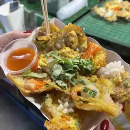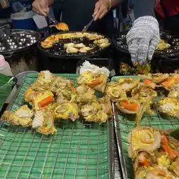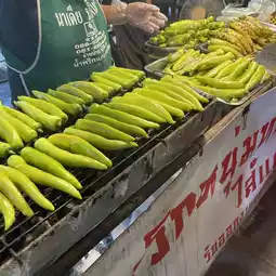 This market is divided into 4 zones, but we walked around and didn’t know if we got to every zone 😂 There are so many foods and desserts here that we couldn’t decide what to eat. But we happened to see “Khai Krok Songkhrueng” which was just put in the pan, so we decided to give it a try 👍🏻 Next, we had stuffed peppers 🌶️ It was the first time we tried it and we loved it. If we saw it anywhere else, we would definitely go for it.