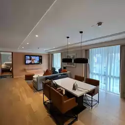 The room is big enough to run and play ball in. The living room and dining table area are oversized. There is also a small space with a refrigerator and microwave oven. There is room for another single bed in the room. The luggage room and bathroom are missing from the photo, but the space is very large, with a bathtub, double sinks, and two toilets