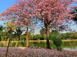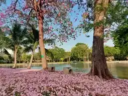 The season of viewing pink trumpet flowers has arrived. For those who have little time, you don't have to go all the way to Kasetsart University, Kamphaeng Saen. You can take the BTS to Chatuchak Park. It's perfect for the city lifestyle. You can view it from the BTS station and see the pink flowers along the road, or you can walk into the park to take close-up photos. It's just a short walk from the entrance. Stop by to take photos before going home or before going to work. It's a different kind of feel. The light is beautiful in a different way. Hurry up and come see it before the flowers wither away.