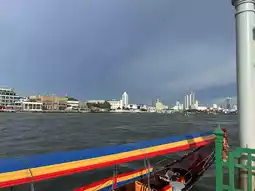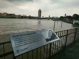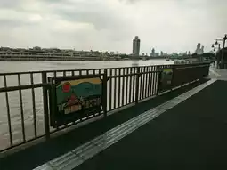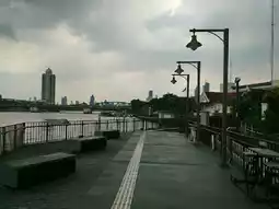 In the evening, the walkway along the Chao Phraya River embankment stretches from Wat Kalayanamitr to the end of Phra Phuttha Yodfa Bridge near Wat Prayurawongsawat.