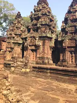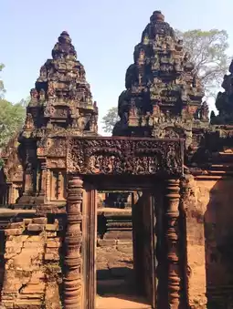 Banteay Srei is unique among Angkor temples as it is the only major temple not built by a king. Instead, it was constructed by a minister of King Rajendravarman II. The temple's use of red sandstone, a relatively soft material, allowed artisans to carve detailed patterns as if working with wood.