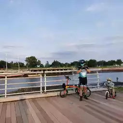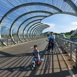 There is a comfortable cycling path for its users. Crossing an aesthetic bridge leads to a spacious park with pedestrian and bicycle paths surrounded by beautiful, lush trees and plants, connected to a dock that is often used for arts festival performances.