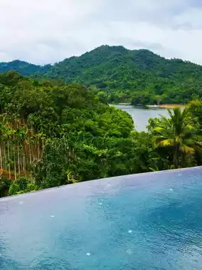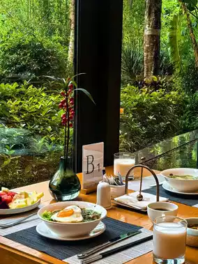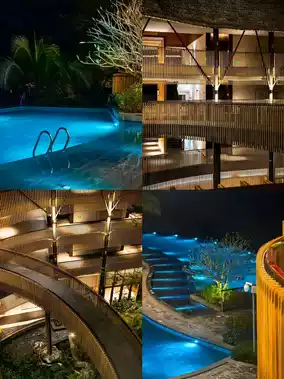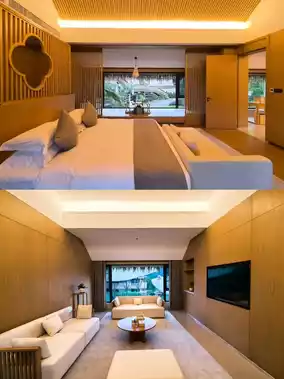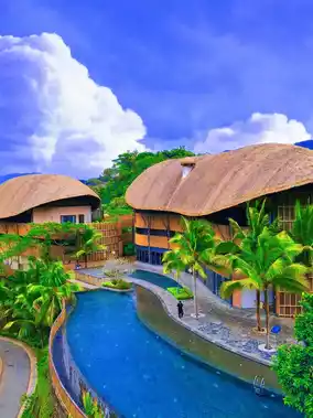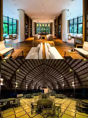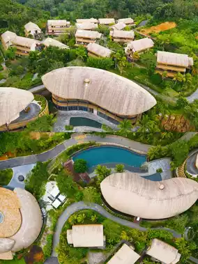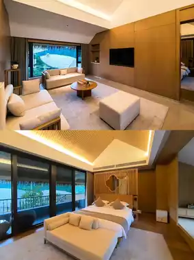The hotel's overall design style is primitive + wellness. The thatched roof buildings have a Bali feel. The hotel's infinity pool is stunning! It overlooks the vast expanse of the original tropical rainforest and lakes, giving you a sense of being wrapped in the wilderness.