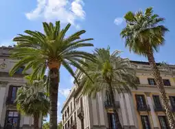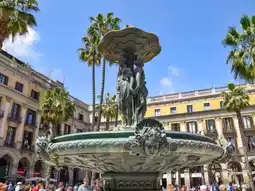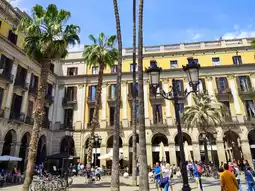 Plaça Reial is a famous square in Barcelona. It's in the Gothic Quarter, near the popular Ramblas. The square was built in 1848 by architect Francesc Daniel Milona and is car-free with a typical Spanish atmosphere. It has many terraces, a central fountain, a gallery of arches, and stately palm trees which give the square a special Mediterranean feel.