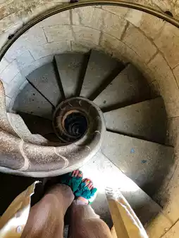Then, you take the elevator to the tower and the spiral staircase to go down.