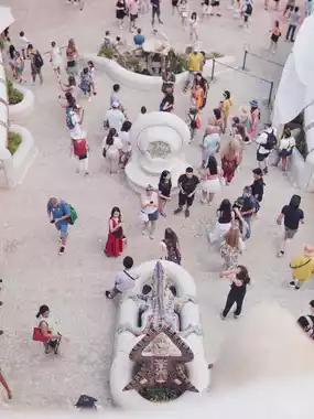 The 110m undulating bench decorated with crushed tiles and glass is said to be the longest in the world. 🥹