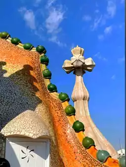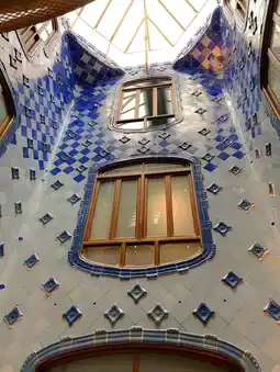 The interior courtyard is covered with tiles designed by Gaudí, transitioning from deep blue at the top to light blue and white at the bottom. The attic features an organic structure formed by Gaudí's signature catenary arches. On the rooftop terrace, the roofline resembles the side of a dragon, pierced by a marble cross with four arms and four sets of chimneys.