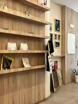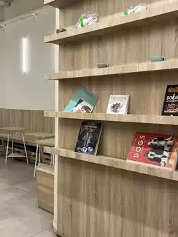 The café also offers various pastries, and there are cute canvas totes and other items displayed on the bookshelf.
