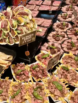 Prosciutto, colorful pintxos, seafood, freshly squeezed fruit smoothies