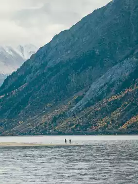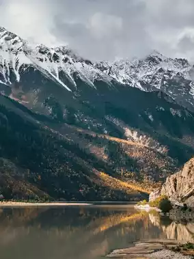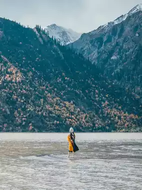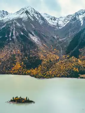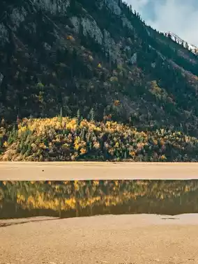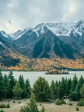 The downstream area is at a relatively lower altitude, where tall forests replace low shrubs between the mountains. Here, autumn is characterized by golden colorful forests set against pure white snow-capped mountains, each with its own distinctive features.