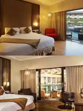 I stayed in one of the resort's villas, which was spacious and luxurious with a clever layout. The interior decor was dominated by natural elements, with wooden furniture and stone accents creating a rustic yet elegant atmosphere. The villa had a private pool and terrace, allowing me to enjoy my private time and take in the beautiful views of the resort.