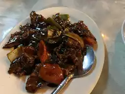 The sea bass was fried to a perfect crisp with tender meat beneath the golden skin, and the savory soy sauce brought everything together. The black pepper beef had a strong, punchy kick that paired well with rice, while the drunken prawns were fresh and fragrant with Chinese wine.