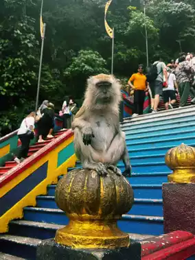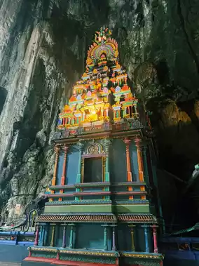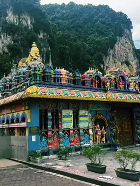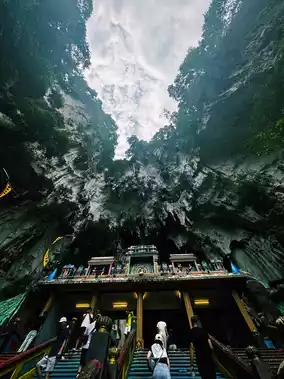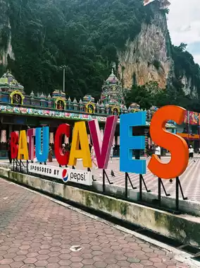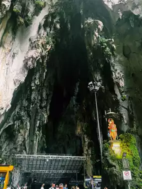 Batu Caves, located on the outskirts of Kuala Lumpur, is a Hindu holy site with a huge golden statue of Lord Murugan and colorful stairs.