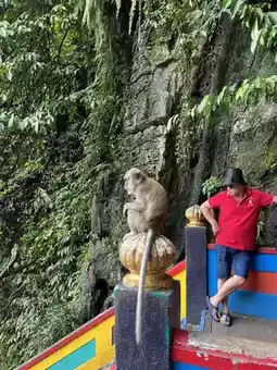 When walking up the stairs, I must say that it is tiring. But along the way, you will encounter monkeys everywhere. Be careful of your bags, food, and things you grab, or you will get snatched away, haha.