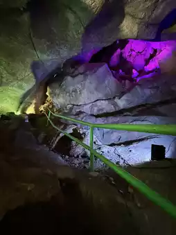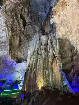 While you're distracted by the monkeys and unsure where to go, clever workers will beckon you into a cave on the left. Just to escape the animals, you follow their lead, pay 15 ringgit for entry, and find yourself in a magical cave with colorful lighting and scenes from Indian scriptures. You realize this isn't the classic cave with countless steps you remember from the guidebook. Yes, it's a different cave, but it's still interesting to see. There are also stairs, waterfalls, and it's very stuffy. This cave features crevices with stalactites and stalagmites, all illuminated.