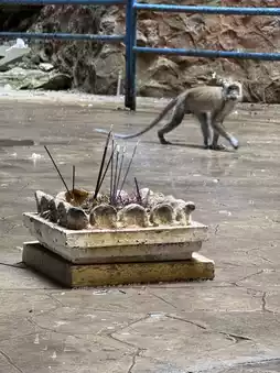 Once you pass the rows of shops, you're greeted by hordes of monkeys—big, small, aggressive, energetic, sleepy. There are so many of them, and if you have food in your hands, forget about it—it will quickly end up with a monkey. They skillfully snatch treats from your hands and might even jump onto your head or shoulders. It's a nightmare.
