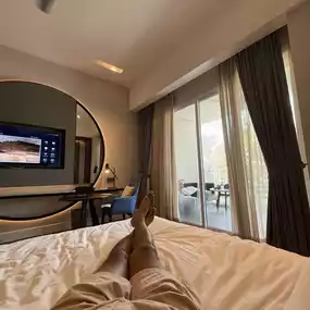 Once the key card tapped, the door opened to a beautiful, jaw-dropping room! Nothing in the room I didn’t like. The king bed was so comfy with clean and crisp linen, oh they sure knew how to pamper me. The best part would be the balcony. Guess what, they had a built in bathtub complete with hot and cold water!