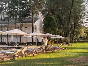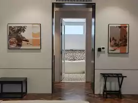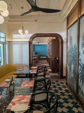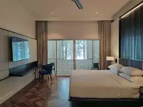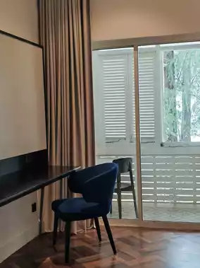 The most commendable aspect of the hotel is its perfect grasp of the vacation vibe. From the gaps between the lush old trees, you can see the endless sea and sky. The pure white wooden shutters filter the sunlight, casting dappled shadows. The gently swaying banana leaves, the empty poolside loungers, the mosaic tiles, and the peacock blue wooden doors—all create a serene and idyllic scene.