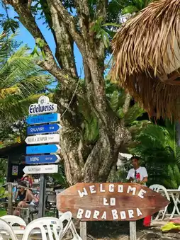 Bora Bora Café sits right on the beach, offering open-air seating under swaying coconut trees and colorful parasols. The rustic wooden furniture, tiki torches, and soft lighting at night create a cozy and romantic setting—ideal for couples, families, or groups of friends looking to unwind by the sea.