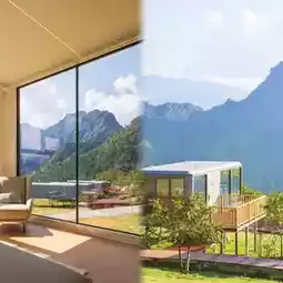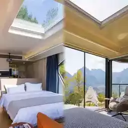 The room has a 1.8m large bed and a sofa, two floor-to-ceiling windows and a terrace with a 270° mountain view. There is also a glass skylight on the top. When the weather is good, you can lie on the bed and look at the blue sky, white clouds and stars.