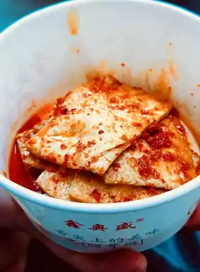 ①The tofu has a unique taste. You can find out where this tofu shop is just by asking. The taste is a little spicy. Friends who can't eat spicy food must ask in advance for less spicy. It's the first time I eat tofu cooked this way. After it's fried, I saw it dipped in a small bowl. It's a very unique way of cooking. It's the first time I've seen it and eaten it.