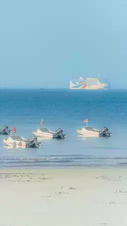 There are also many ships parked here, which is really spectacular! 🚢 Many people also take wedding photos here! There are also many places to eat near Guantouling Beach, where you can buy mineral water, grilled sausages, coconut juice, seafood specialties, and more.